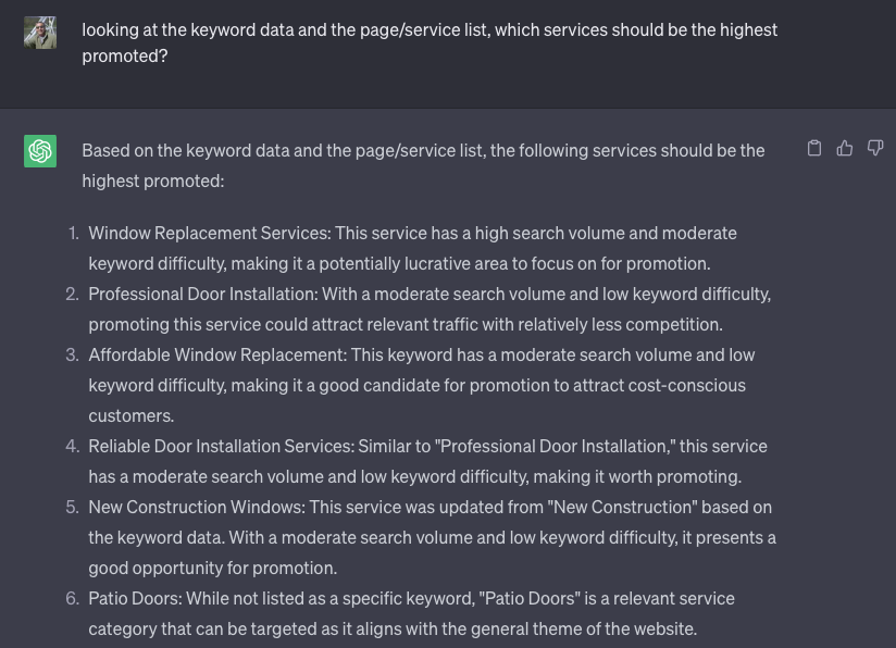 Going back to that window expert that I had at my fingertips, what if I could give them today’s SEO data and have them analyze it for me? Then when I ask it questions I can get instant answers to SEO questions. Its like having a research assistant that instantly knows the answer to any question I can have about my client’s industry and customers. So let’s dive into a little case study on how I used it to build https://shamrockwindowanddoor.com/