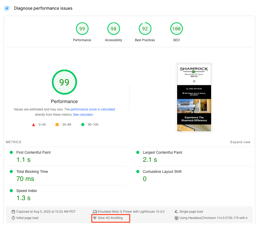 The end result was a high-performing website that scored a 99 on Google’s metrics. It’s not just a website; it’s a strategic tool optimized to convert. Shamrock Window and Door now has an online presence that not only looks great but also serves as a formidable competitor in the Seattle market.