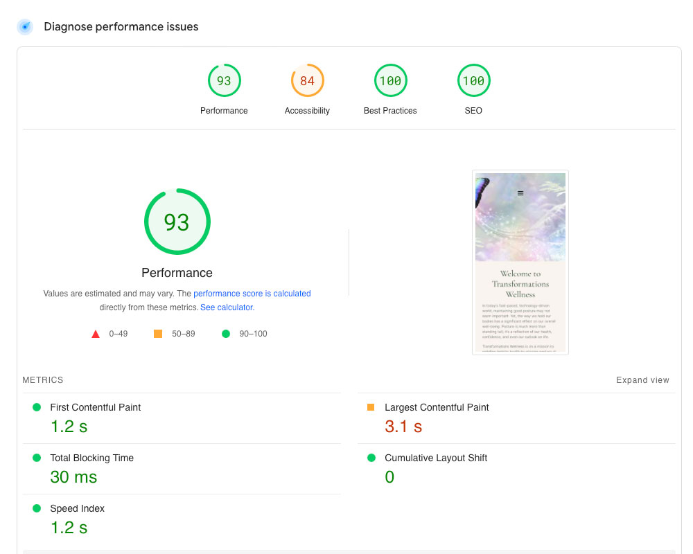 To propel Transformations Wellness to the zenith of search results, we zeroed in on four cornerstone metrics: Performance, Accessibility, Best Practices, and SEO. Recognizing the predominance of mobile users, we finessed the site to deliver blazing speeds across all device formats. Concurrently, we rigorously aligned with Google’s best development practices.